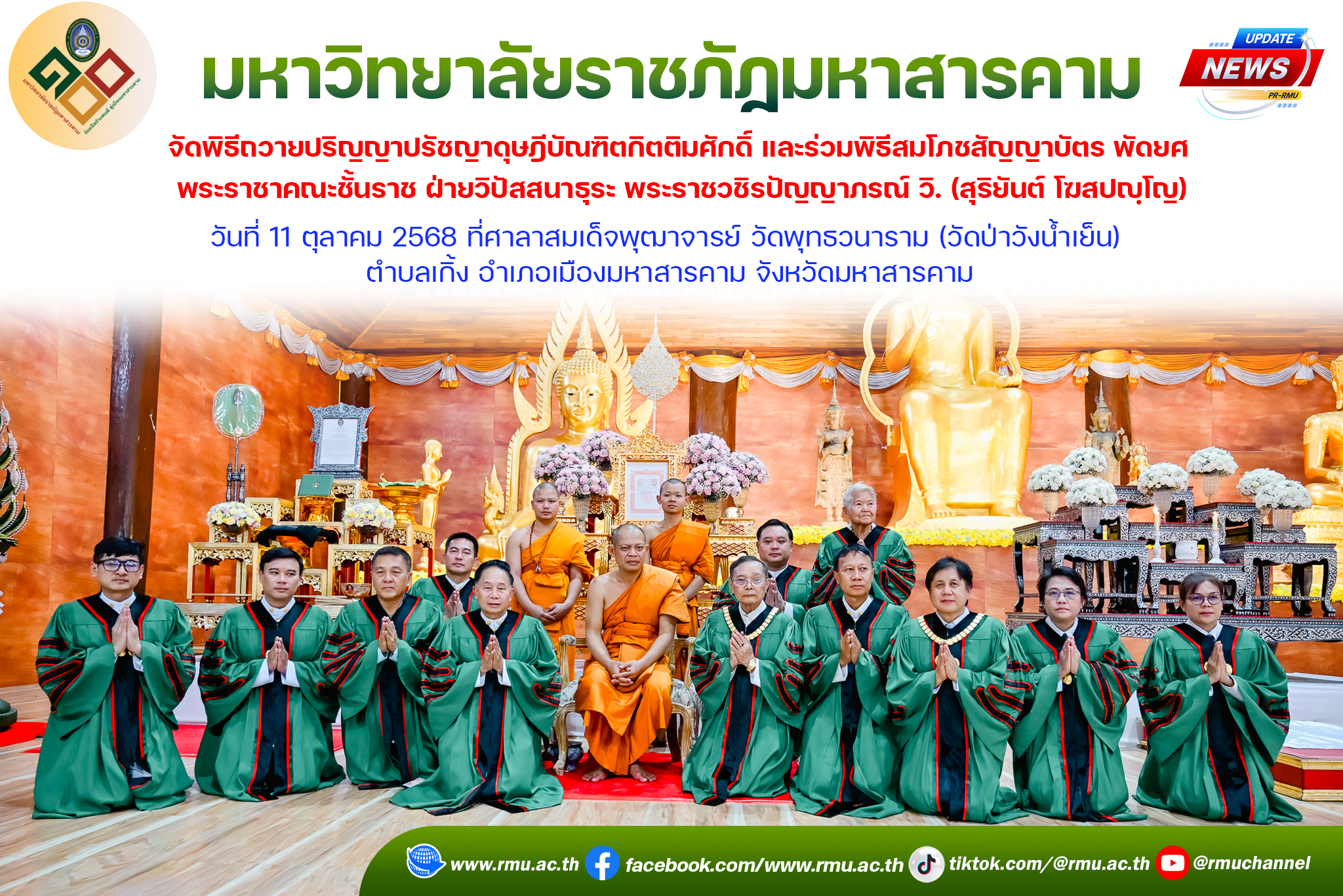 มหาวิทยาลัยราชภัฏมหาสารคาม จัดพิธีถวายปริญญาปรัชญาดุษฎีบัณฑิตกิตติมศักดิ์ และร่วมพิธีสมโภชสัญญาบัตร พัดยศ พระราชาคณะชั้นราช ฝ่ายวิปัสสนาธุระ พระราชวชิรปัญญาภรณ์ วิ. (สุริยันต์ โฆสปญฺโญ)